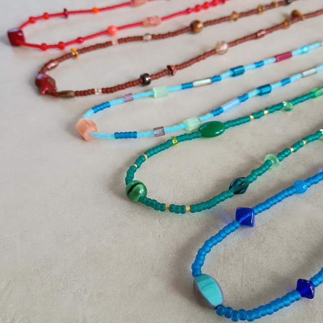 シンプルコーデに、魔法の一本。 彩り豊かなビーズの輝きを。 ガラスビーズ特有の透き通るような光沢と、ひとつひとつ形の異なるチェコビーズがリズム良く配置され、表情豊かな仕上がりです ぷっくりと丸いゴールドとシルバーのマグネットクラスプが、後ろ姿まで可愛らしく演出。 近づけるだけでピタッと留まるので、忙しい朝でもストレスなく簡単に付け外しができるのも嬉しいポイントです。 ※外すときはネックレスを引っ張らずに、マグネットを持って外してください。 サイズ: 約42〜44cm カラー: ①レッド 約42cm ②ブラウン 約44cm ③グリーン 約43cm ④ライトブルー 約43cm ⑤ブルー 約43cm 留め具: マグネット 素材: チェコガラスビーズ、国産ガラスビーズ 繊細な商品の為、お取扱い・保管について充分にご注意ください。 無理な力は加えないようにお願い致します。また、1点ずつ手作業で製作しておりますので若干の個体差が出る場合がございます。 作品は出来るだけ現物と同じになるよう撮影しておりますが、若干色味が違う場合もございます。PCディスプレイの性質上、実際の色と異なって見える場合がございますので予めご了承ください。 #ガラスビーズ #チェコビーズ #付け外し簡単