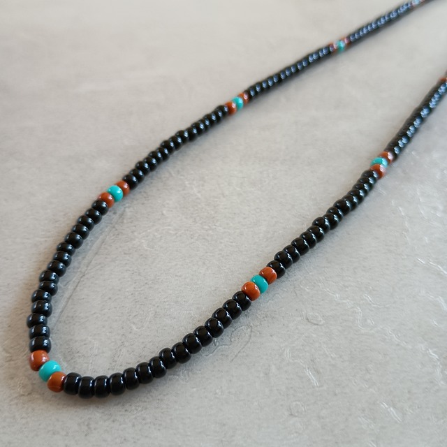 【47cm】ネイティブ ガラスビーズ ネックレス / ユニセックス / ブラック×ターコイズ×ブラウン 派手すぎない落ち着いたトーンで、カジュアルスタイルに自然に馴染みます 留め具には、ヴィンテージ感漂うアンティークゴールドのネジ式を採用 外れにくく、見た目もスッキリとスタイリッシュです 軽やかな付け心地で、1日中着けていても負担にならない軽さが魅力 シルバーネックレスやレザーアクセサリーとの重ね付けもOK シャツの襟元から覗かせるのはもちろん、男女問わず、素肌にも服の上にも馴染むユニセックス仕様です 全長: 約47cm(金具含む) 太さ: 約3mm 素材: ガラスビーズ(日本製) 留め具: ねじ式 (アンティークゴールド) ベースカラー: ブラック 繊細な商品の為、お取扱い・保管について充分にご注意ください。 無理な力は加えないようにお願い致します。また、1点ずつ手作業で製作しておりますので若干の個体差が出る場合がございます。 作品は出来るだけ現物と同じになるよう撮影しておりますが、若干色味が違う場合もございます。PCディスプレイの性質上、実際の色と異なって見える場合がございますので予めご了承ください。 ネイティブ/ガラスビーズ/重ね付けOK/日本製/アンティークゴールド/古着/アメカジ/ユニセックス