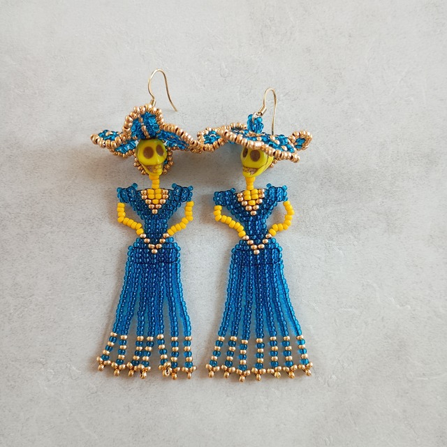 メキシコで最も愛される骸骨「カトリーナ」✨ 骸骨の貴婦人「カトリーナ」は、死者の日を象徴するアイコンとして古くからメキシコ人に愛されています メキシコ好きにはたまらない! カトリーナが耳元を彩ります✨ 全長: 約8.5cm(金具含む) 重さ: 片耳約5.5g(金具含む) ベースカラー: ブルー ビーズ: ガラス(日本製) 金具: シルバー ・フック サージカルステンレス ・ネジ式イヤリング メッキ ※ オプションより希望の金具を選択してください。 ☆サージカルステンレスとは医療用器具に使われる316Lステンレスを使用したものです。金属アレルギーの方に最適な素材です。 注意: サージカルステンレスはアレルギーが起きにくい素材ではありますが、すべての方にアレルギーが起きないことをお約束するものではありません。 アレルギーには個人差があります。 アレルギーに関して当方は責任を負い兼ねますので予めご了承ください。 繊細な商品の為、お取扱い・保管について充分にご注意ください。 無理な力は加えないようにお願い致します。また、1点ずつ手作業で制作しておりますので若干の個体差が出る場合がございます。 作品は出来るだけ現物と同じになるよう撮影しておりますが、若干色味が違う場合もございます。PCディスプレイの性質上、実際の色と異なって見える場合がございますので予めご了承ください。 メキシコ/カトリーナ/死者の日/メキシカンスカル/カラベラ/スカル/フリンジ/大ぶり/揺れる/coco/リメンバーミー/サージカルステンレス/金属アレルギー対応/ピアス/イヤリング