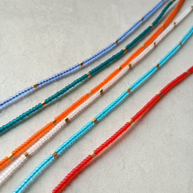 吸い込まれるような瑠璃色 深く鮮やかな「瑠璃色」のガラスビーズを主役に、ゴールドのアクセントを等間隔に配置しています マットなゴールドビーズが、カジュアルになりがちなビーズネックレスに高級感をプラス 鎖骨のラインに綺麗に沿うスタンダードな長さです。 留め具はしっかりと固定できるネジ式を採用。外れにくく、見た目もスッキリとスタイリッシュです カラー: 瑠璃色 × ゴールド 素材: ガラスビーズ 全長: 約40cm 太さ: 約3mm 金具: ねじ式 繊細な商品の為、お取扱い・保管について充分にご注意ください。 無理な力は加えないようにお願い致します。また、1点ずつ手作業で製作しておりますので若干の個体差が出る場合がございます。 作品は出来るだけ現物と同じになるよう撮影しておりますが、若干色味が違う場合もございます。PCディスプレイの性質上、実際の色と異なって見える場合がございますので予めご了承ください。