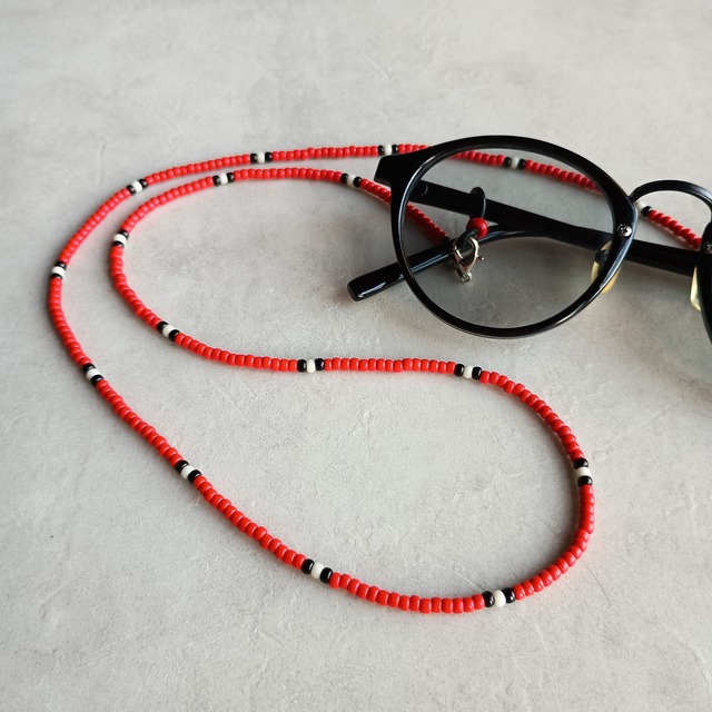 グラスコード 3wayグラスコード 置き忘れ防止!失くさない! メガネストラップとしてだけでなく、マスクストラップやネックレスとしてもお使いいただける多機能なグラスコードです。 ビーズを一粒ずつ丁寧に組み合わせ、模様を作ります。 視覚的にも楽しめるデザインです。 3wayの使い方 メガネストラップ: メガネのフレームにしっかりと装着でき、落下を防ぎます。 マスクストラップ: メガネ留めを外すことで、マスクの紛失防止にも役立ちます。 ネックレス: ネックレスとしてもご使用いただけます。 ビーズのグラスコードは、実用性とファッション性を兼ね備えたアイテムです。 多機能でありながら、見た目にもこだわったアクセサリー。ぜひお試しください♪ 太さ3mmのグラスコードです。 全長: 約70cm(メガネ留め含む) ビーズ: ガラス(日本製) ベースカラー: レッド 繊細な商品の為、お取扱い・保管について充分にご注意ください。 無理な力は加えないようにお願い致します。 また、1点ずつ手作業で製作しておりますので若干の個体差が出る場合がございます。 作品は出来るだけ現物と同じになるよう撮影しておりますが、若干色味が違う場合もございます。PCディスプレイの性質上、実際の色と異なって見える場合がございますので予めご了承ください。 #アメカジ #ファッション #男女兼用 ビーズ/ガラスビーズ/国産ビーズ/グラスコード/メガネストラップ/メガネチェーン/便利/メガネがなくならない/なくさない/置き忘れ防止/マスクストラップ/ネックレス/カジュアル/デイリー/3way/ユニセックス