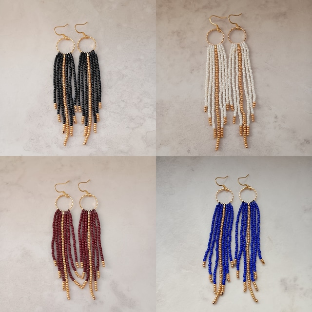 風に揺れる、繊細なガラスビーズのフリンジ 顔周りを華やかに彩るフェザーモチーフの耳飾り ガラスビーズ特有の上品な光沢感があります 歩くたびにゆらゆらと揺れ、視線を惹きつけます ①シックなブラック ②深みのあるダークブラウン ③上品なパールホワイト ④鮮やかなロイヤルブルー 中央のゴールドラインが高級感をプラスし、カジュアルからフォーマルまで幅広く活躍します ビーズ: ガラス(日本製) 金具: ゴールド ・サージカルステンレス(ニッケルフリー金メッキ加工) ・フープイヤリング サージカルステンレス(ニッケルフリー金メッキ加工) ・ネジ式イヤリング メッキ ・フック 14kgf ※オプションより希望の金具を選択してください。 全長: 約9〜10cm(金具含まず) 繊細な商品の為、お取扱い・保管について充分にご注意ください。 無理な力は加えないようにお願い致します。また、1点ずつ手作業で制作しておりますので若干の個体差が出る場合がございます。 作品は出来るだけ現物と同じになるよう撮影しておりますが、若干色味が違う場合もございます。PCディスプレイの性質上、実際の色と異なって見える場合がございますので予めご了承ください。