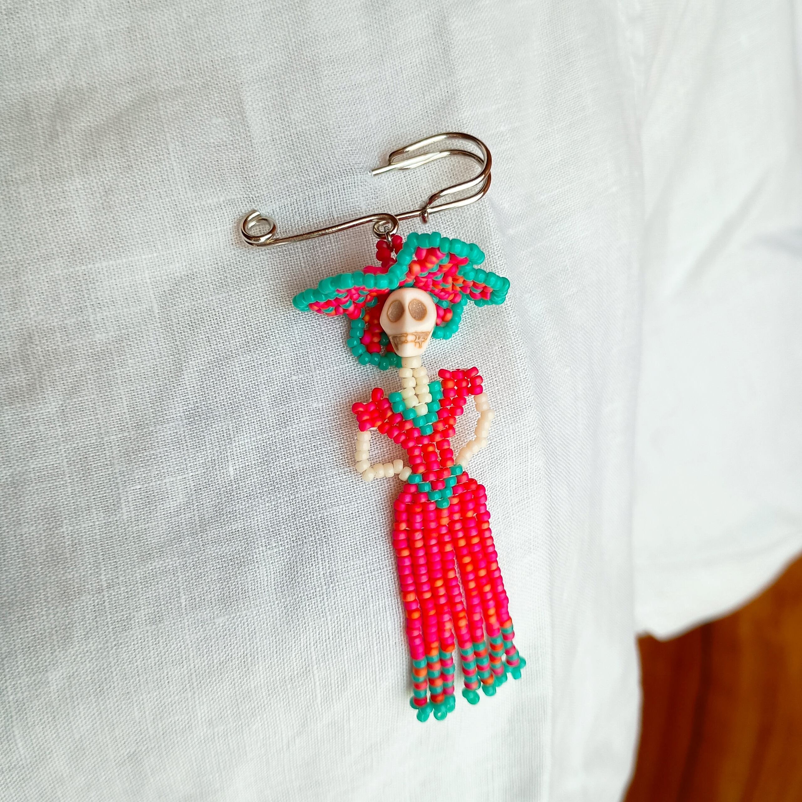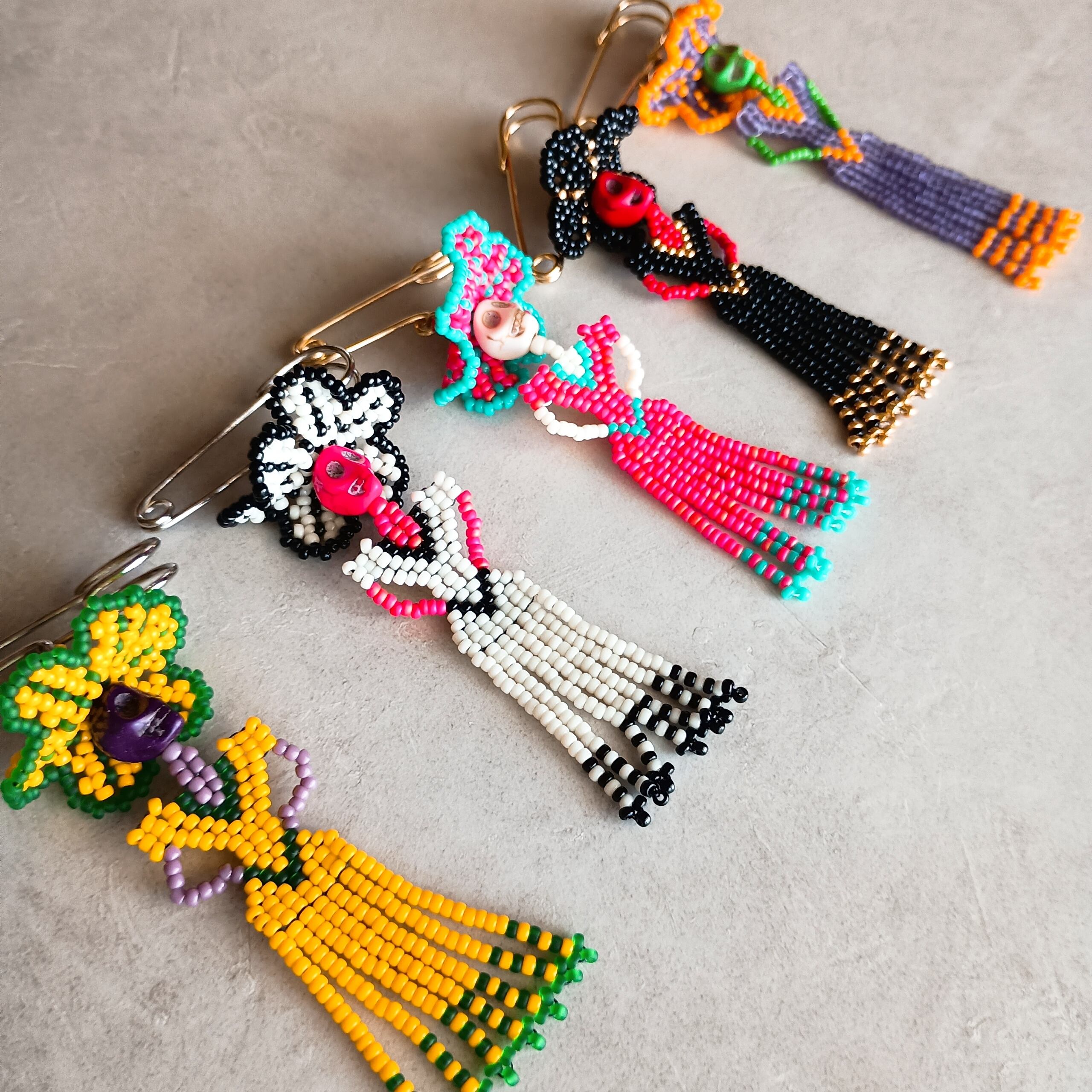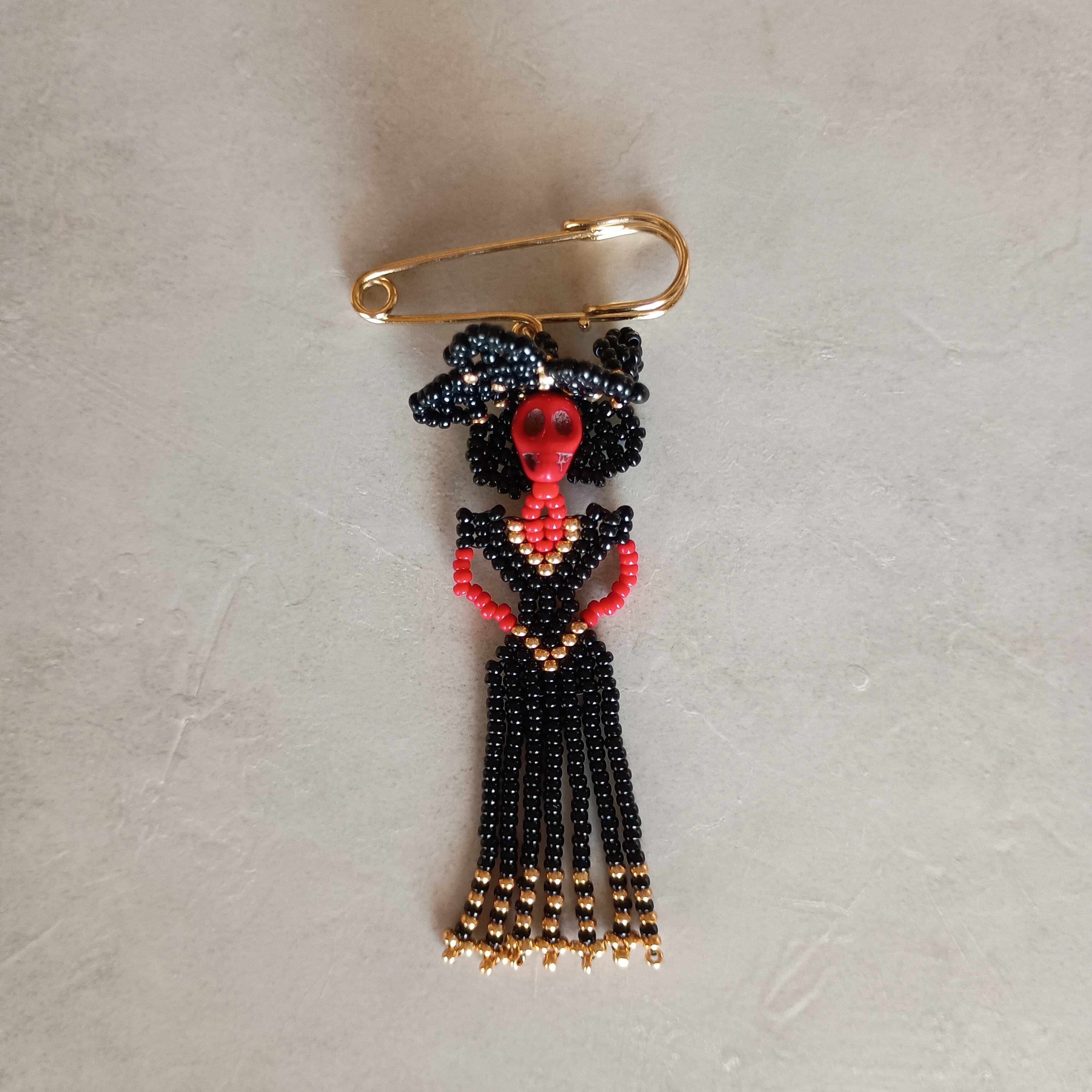 We've created Catrina brooches by combining tiny beads one by one.