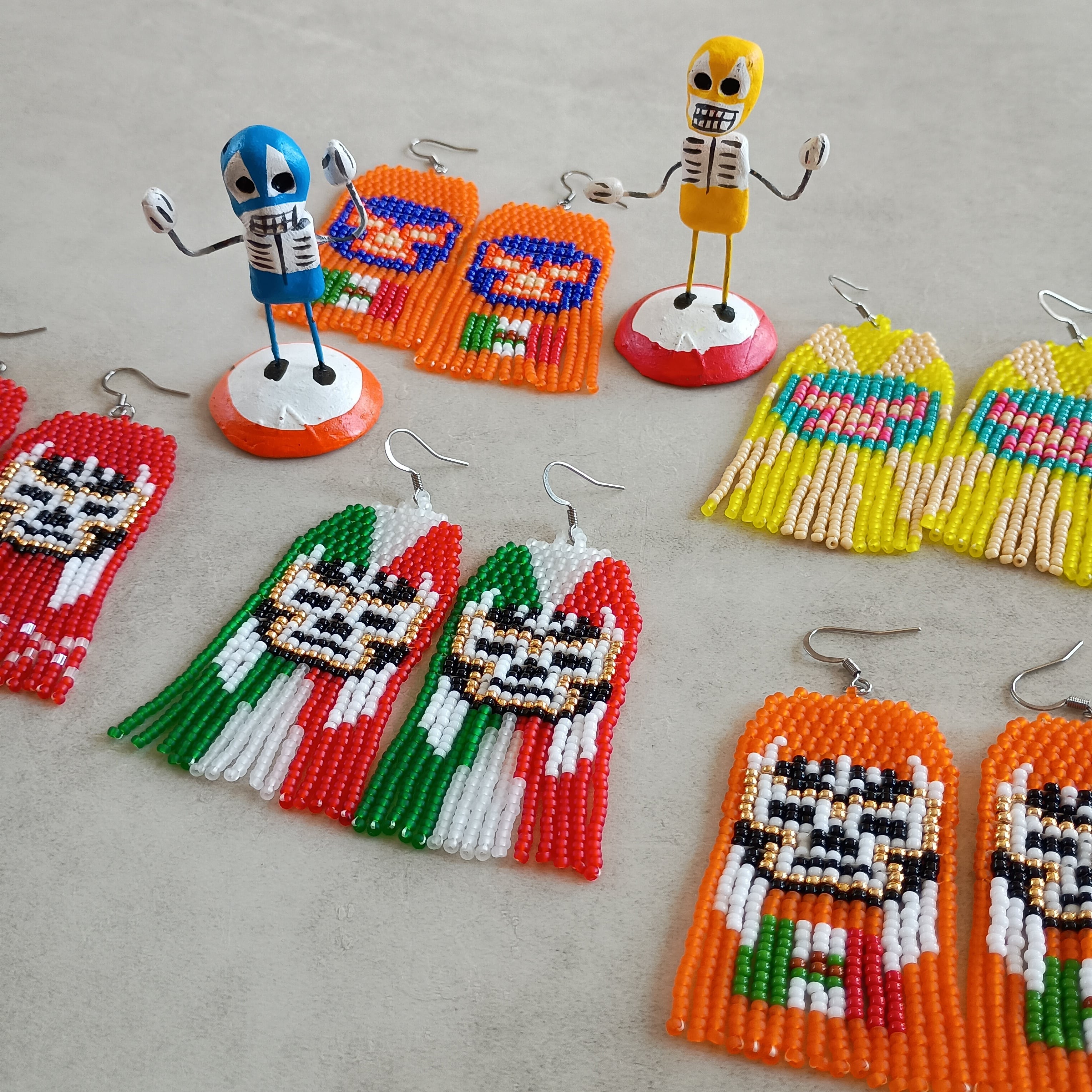 ルチャリブレ/ルチャドール/覆面レスラー/プロレス/メキシコ/個性的/大ぶり/揺れる/フリンジ/ビーズ/ガラスビーズ/国産ビーズ/日本製/サージカルステンレス/金属アレルギー対応/イヤリング/ピアス