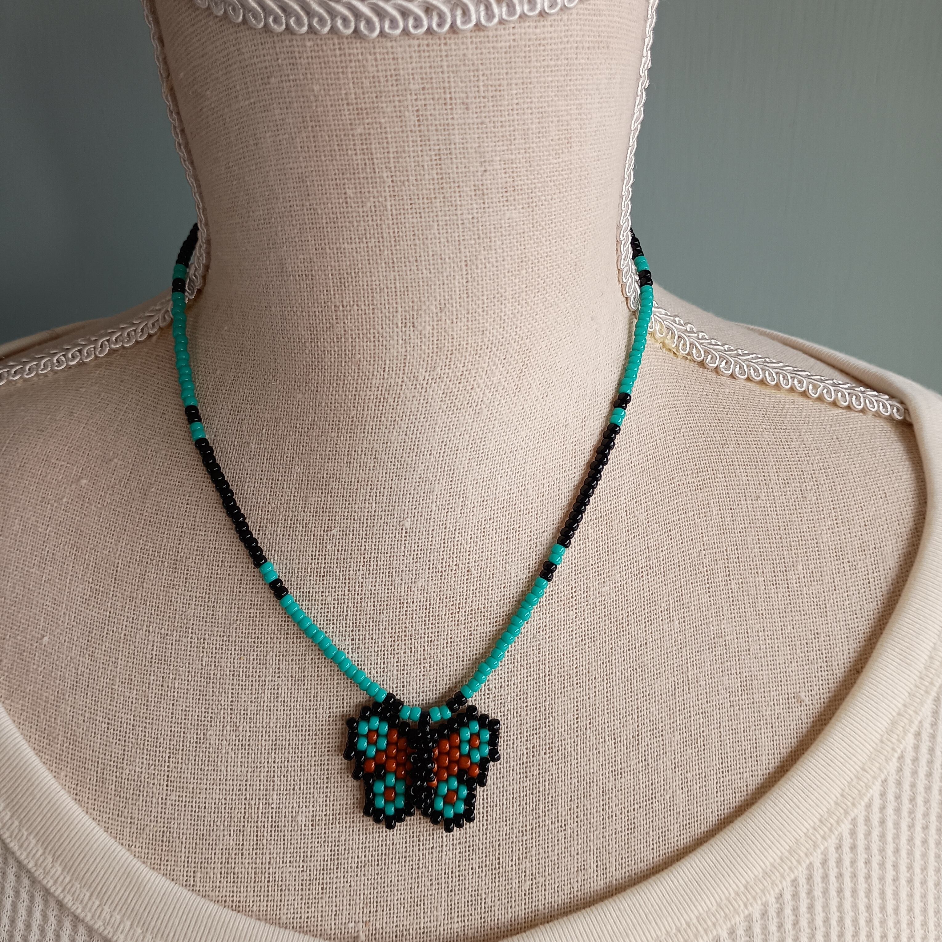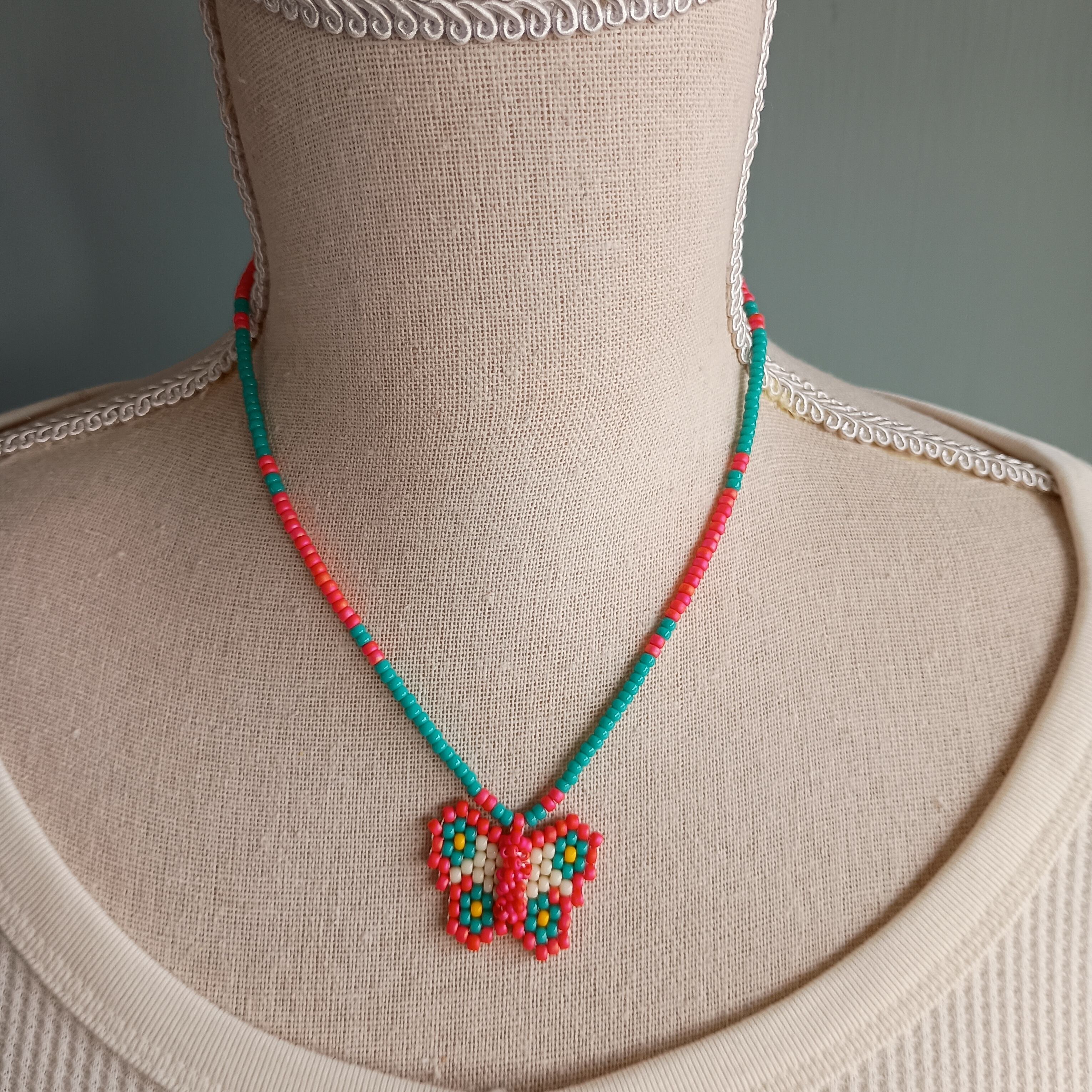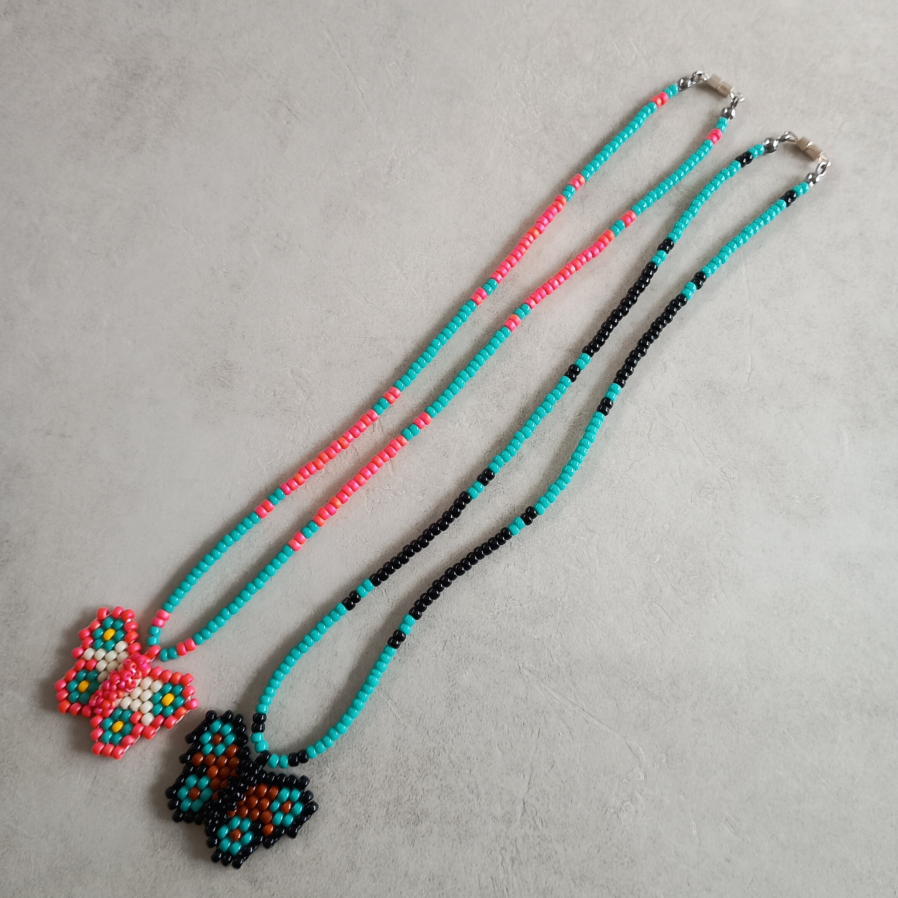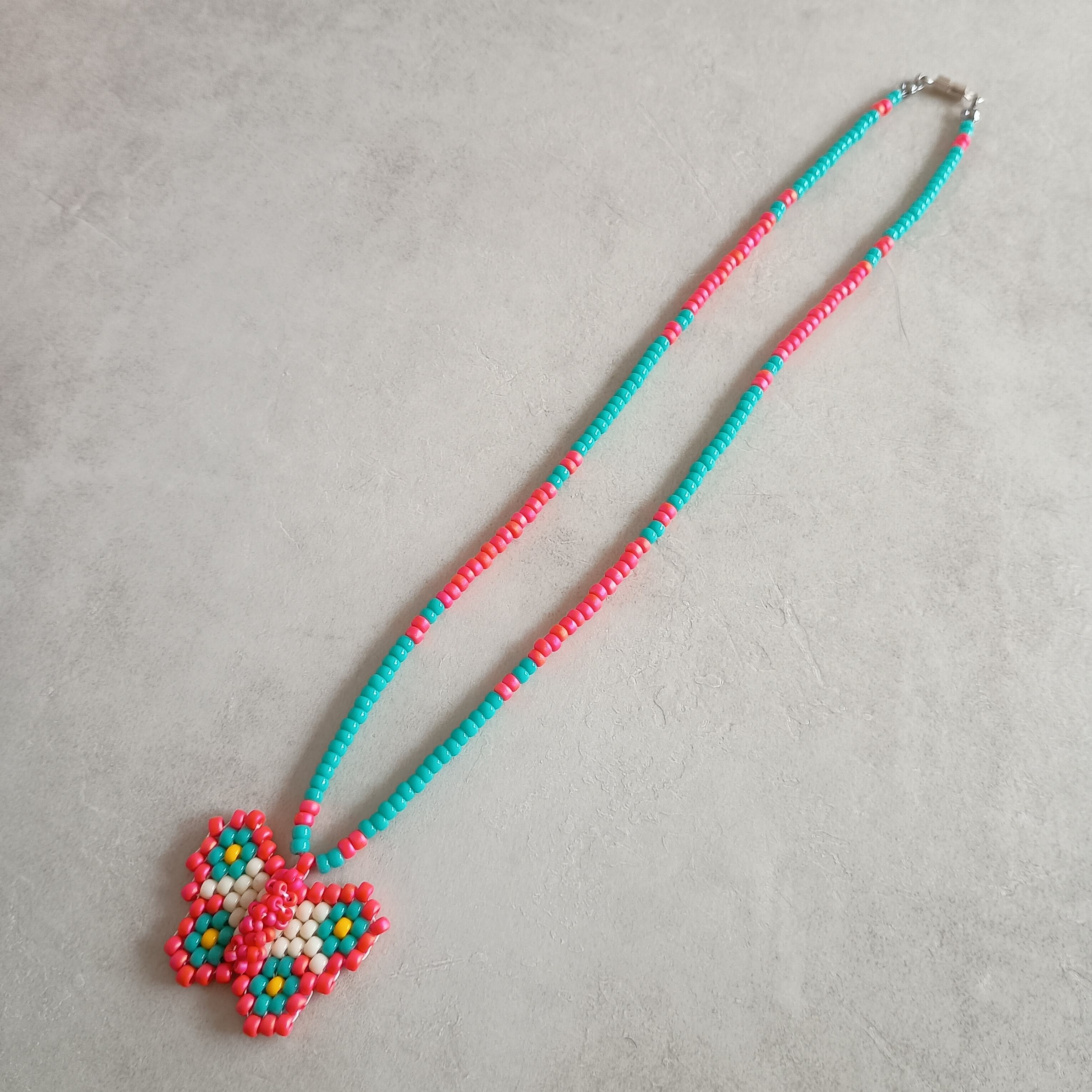繊細なガラスビーズで作られた、蝶のモチーフのネックレスです。
