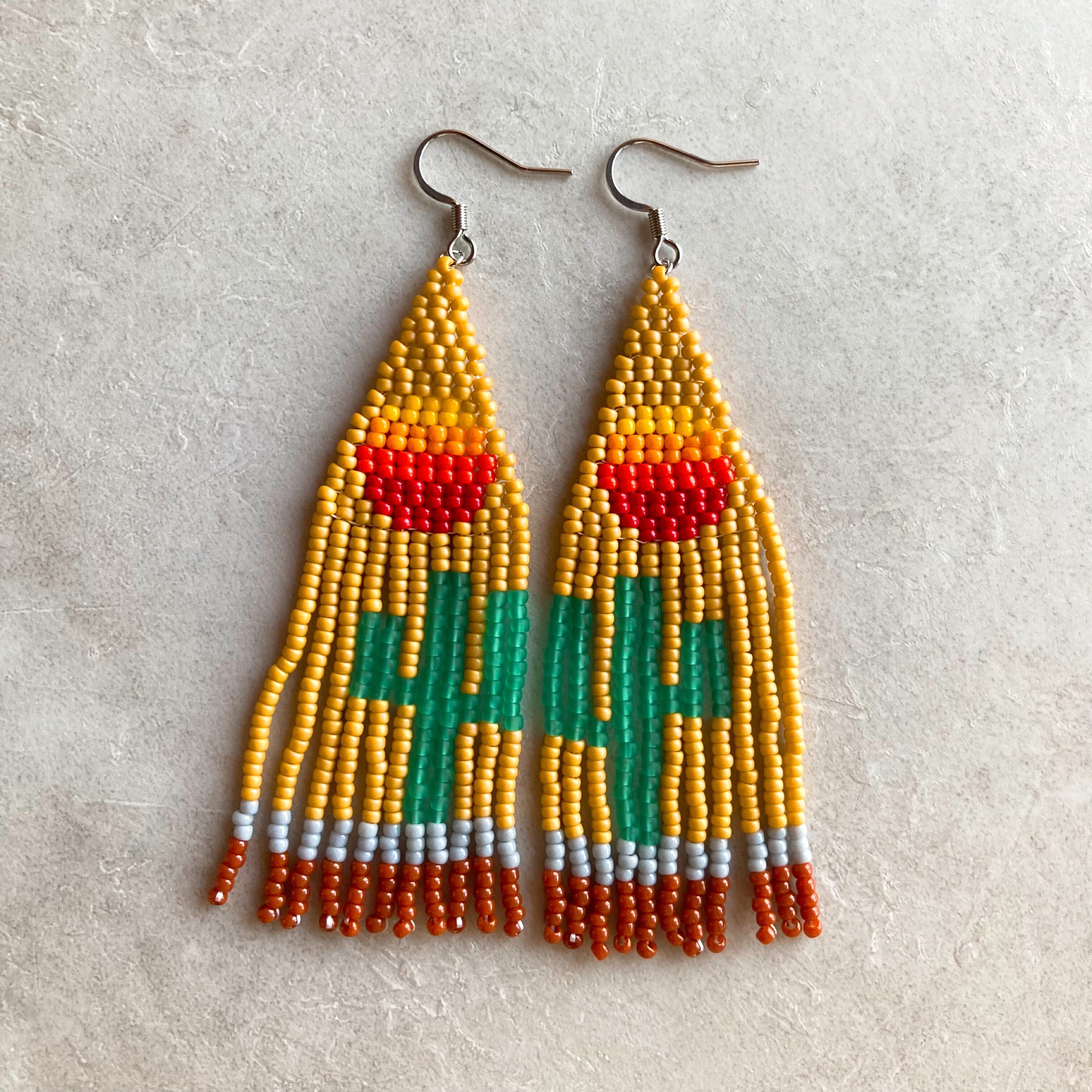 サボテンや太陽、ネイティブなデザインが特徴的なこのピアスは、日本製のガラスビーズを一粒一粒丁寧に編み込み制作しました。