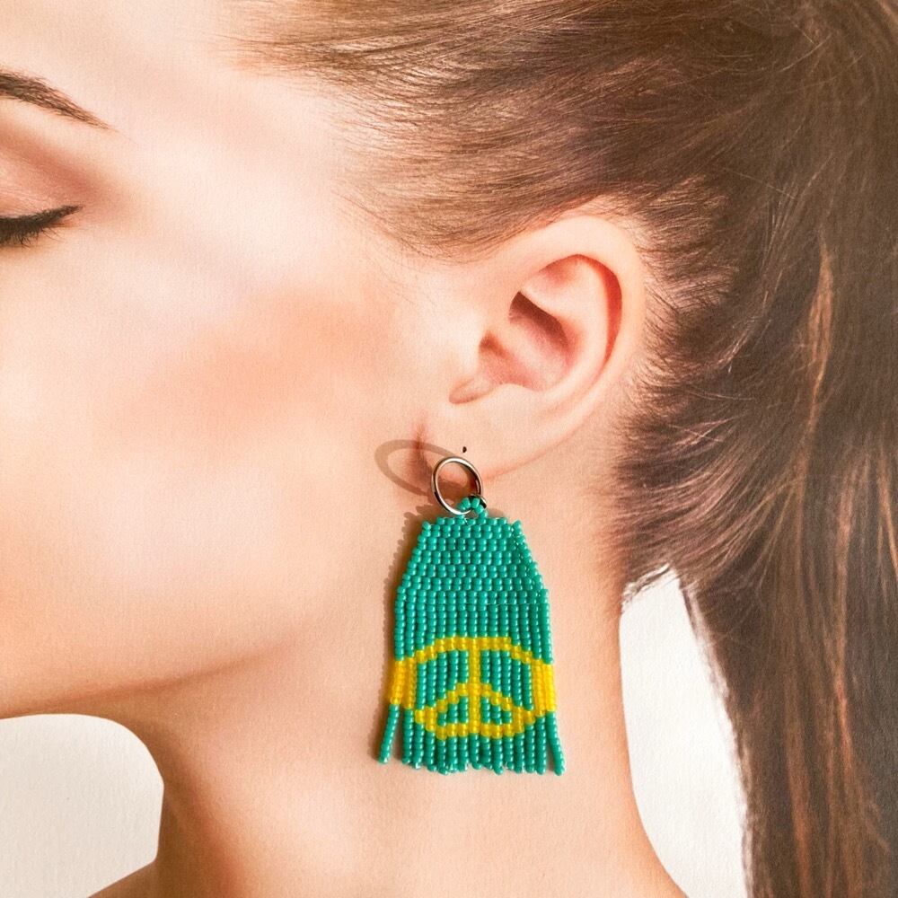 イヤリング/ピアス/国産ビーズ/ガラスビーズ/ビーズ/PEACE/ピース/平和/揺れる/大ぶり/金属アレルギー対応/ターコイズブルー/イエロー/サージカルステンレス/silver925