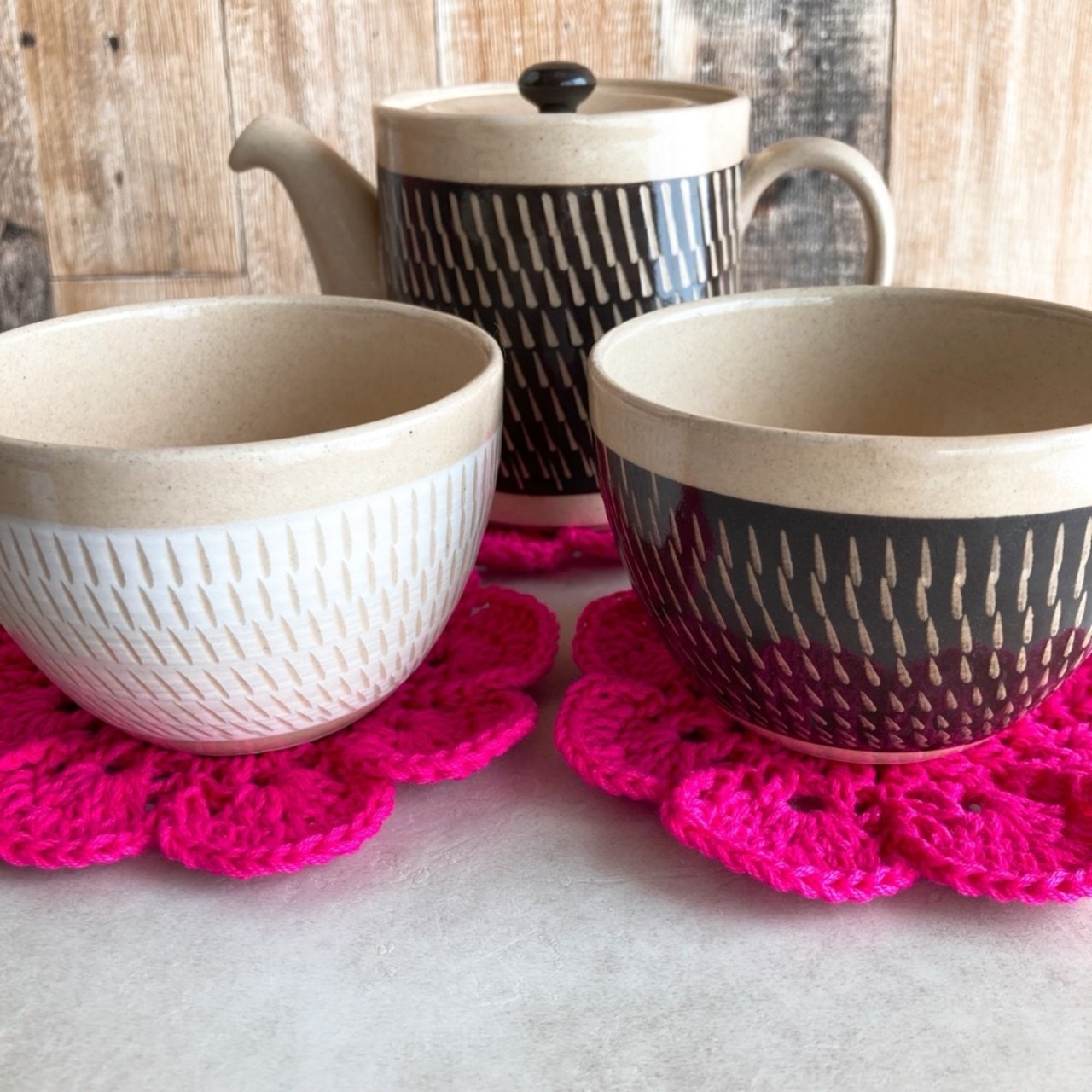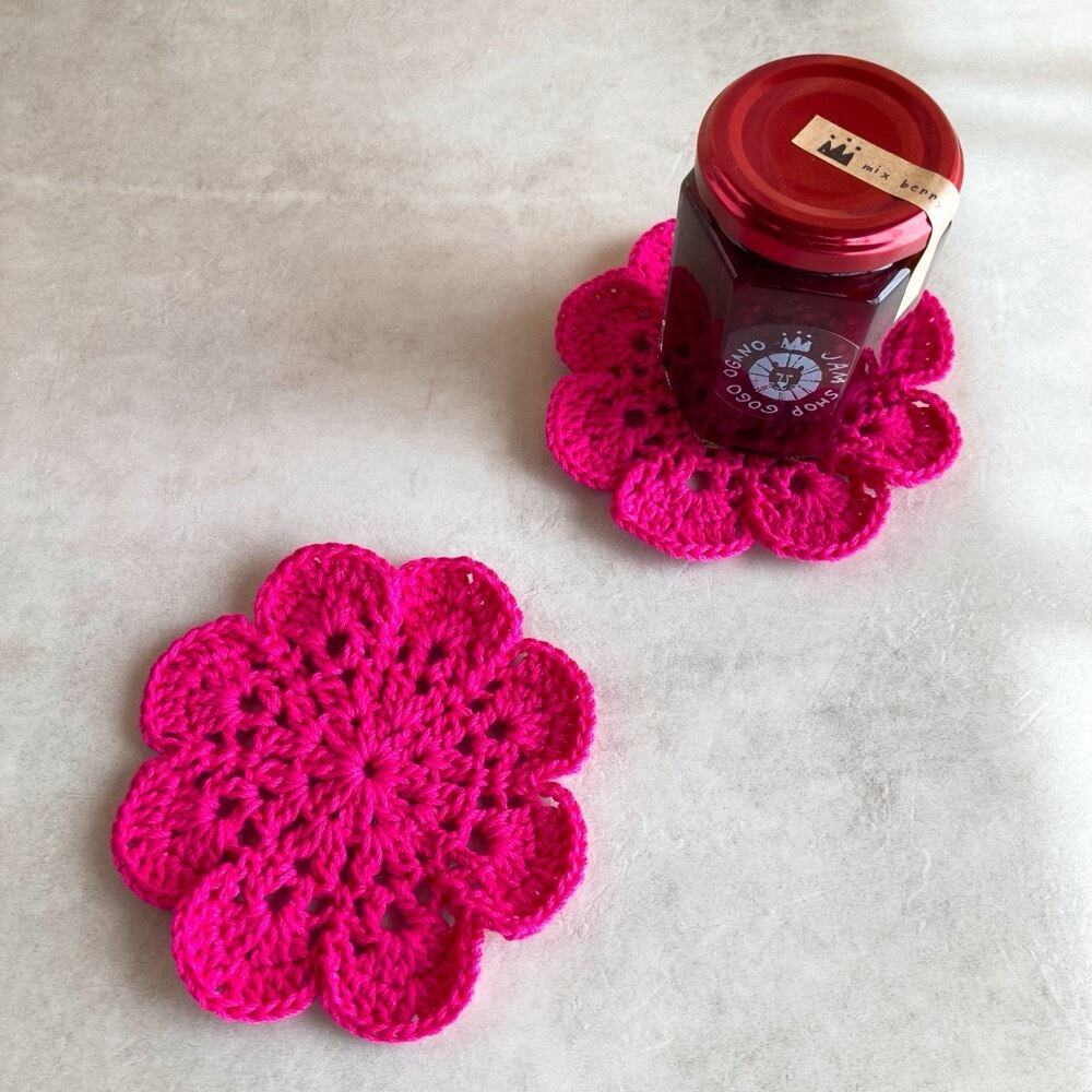カラフルで可愛らしいコースターは綿100%の日本製の毛糸を使用して、かぎ針編みで一針一針丁寧に制作しました。