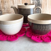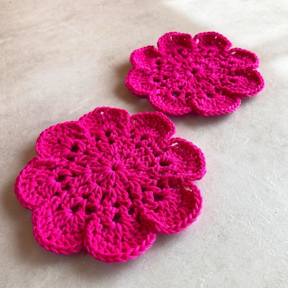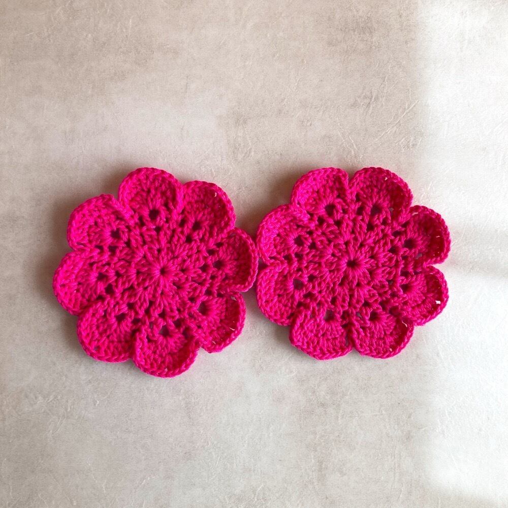 フラワー/花/カラフル/ヴィヴィットカラー/明るい/元気出る/カワイイ/敷物/コースター/綿/コットン/吸水性あり/洗濯可能/エスニック/かぎ針編み/ハンドメイド/2枚セット