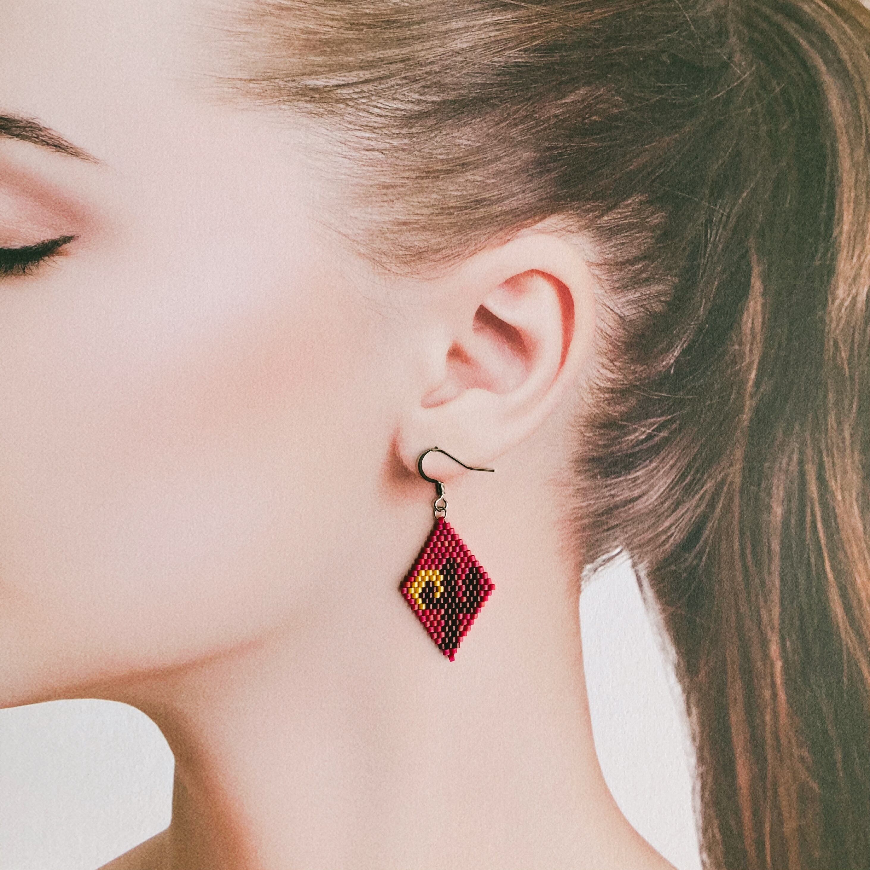ビーズ/ガラスビーズ/国産ビーズ/カジュアル/カワイイ/カッコイイ/個性的/金属アレルギー対応/軽い/軽量/ネイティブ/ボーホー/ジプシー/ボヘミアン/インディアン/フォークロア/フォークロアファッション/古着ファッション/日本製/サージカルステンレス/silver925/ピアス/イヤリング/ダイヤ型/ひし形