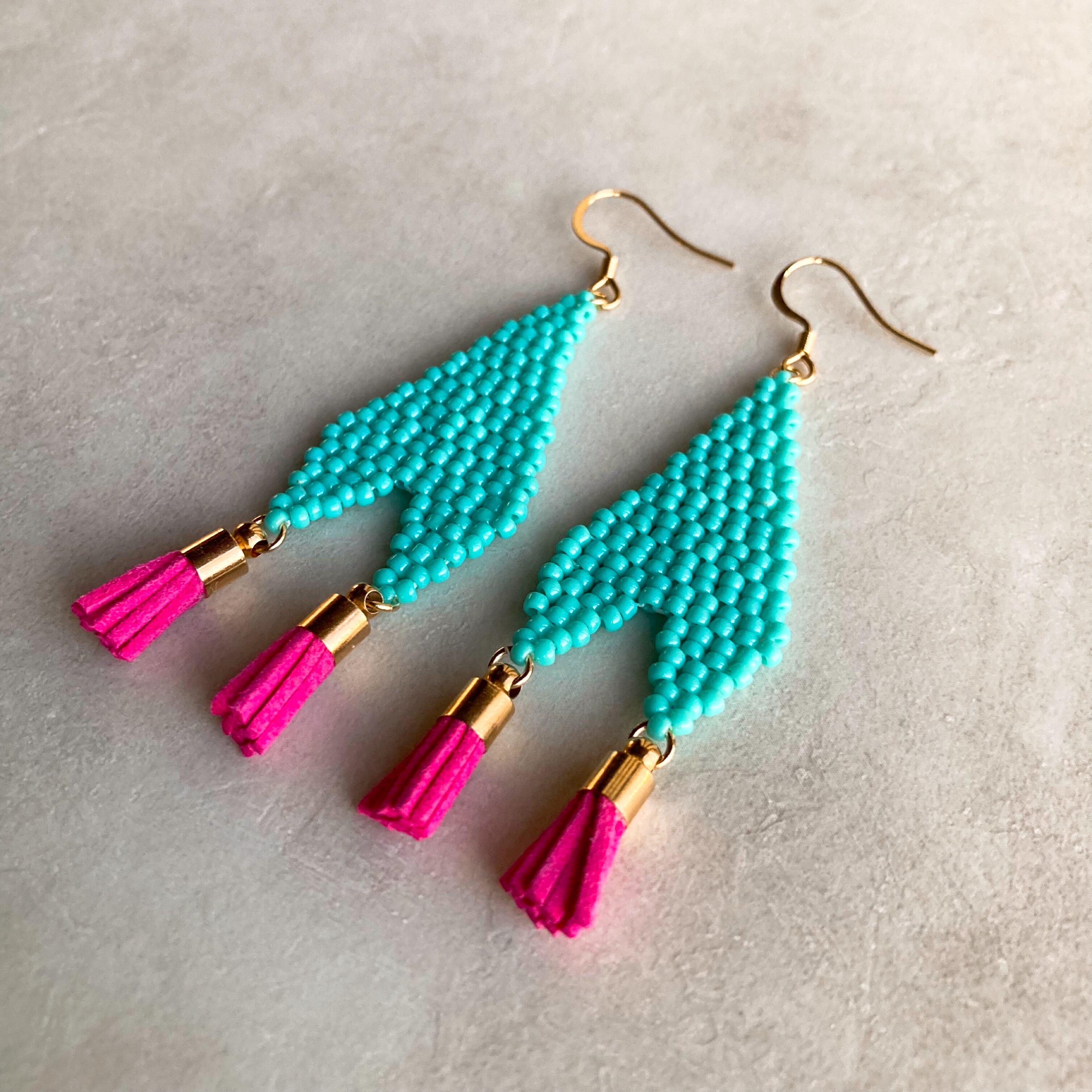 国産のガラスビーズを一粒一粒丁寧に編み込み、小さめのタッセルを2つずつ付けました。
